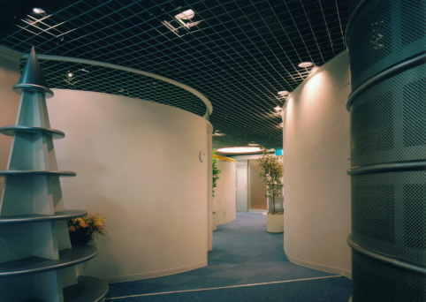 | ホールB 店の中央部分から入口方向を見ています。写真に大きく写る、スタイリッシュなオブジェは、実は、ショーケースになっています。 設置される家具などにも、設計デザインを施し、統一感を生み出します。 通路の壁面はすべて曲面で、柔らかい空間を構成しています。それは、独自の世界観を も、生み出すということに成り得ます。 この世界の中で利用者の方々が「心地よい」と感じていただけたなら、この店舗の、設計計画は大成功です。 お蔭様で、利用者の方々からの、スタッフの方々からも、御盛況を頂きました。 |
