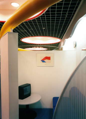 | 待合室 理容院の待合室としては、他に、例を見ないほど、ポップで高級感を感じさせるものにしあげました。 個室間隔で十分な広さと、落ち着いた気分で、ゆったりと自分の番を待つ事が出来ます。 「いつまででも、待っていられる・・」そんな空間を目指して設計計画を手掛けました。 赤、青、黄色を使用し、遊び心をくすぐる、あきの来ない配色と、掘込み天井を配し、その中に大きすぎない、小型の照明を数多く付けることで、より華やかさを演出しています。 「テレビや、ビデオを見ながら・・」といった、利用者の立場での、細やかな心使いも、大切です。 主な内部仕上