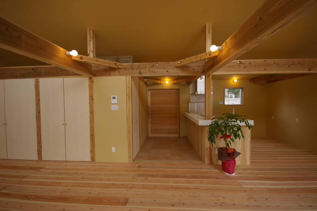 中央には玄関、右側には広々としたキッチン、左側には大きな収納が見えています。