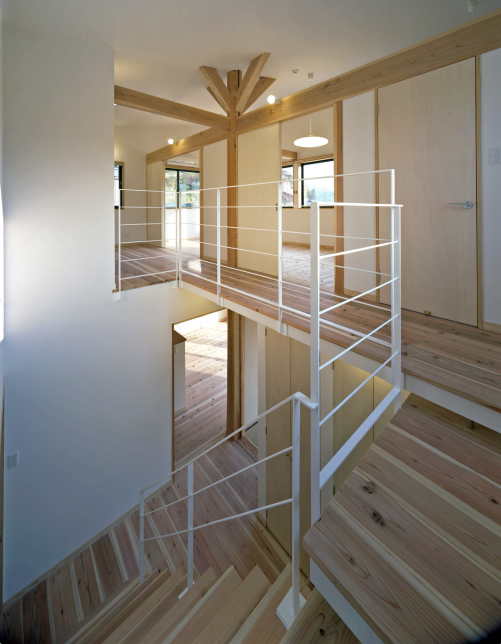 階段の踊り場から、吹抜越しに1,2階を見渡しています。