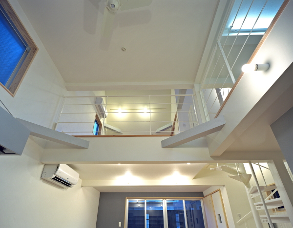 台所から、吹抜けを通して3階主寝室を見ています。