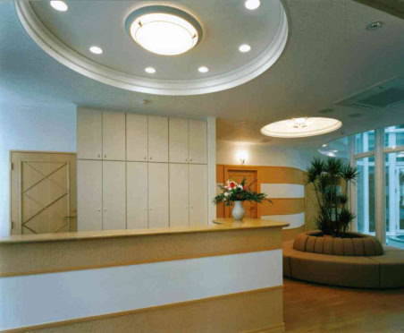 そこで清潔感を全面に打ち出すため直線で美しく整え、木目調の優しさを加え、天井にゴージャスなデザインライトを備えました。 この堀込み天井のライトの配置は、ここの受付のためだけにデザインしたものです。