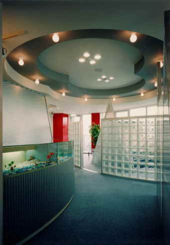 3F 受付・待合ロビー 3階、受付・待合ロビーの、入口からの光景です。 窓から差し込む、日の光が、間仕切り壁の、ガラスブロックを 抜けて、ビル内を 優しく照らします。 二段に堀込まれた天井に、散りばめられた照明、全て、このロビーのためにデザインしました。 さらには、水槽、アクセントとなる真紅の柱、三角の目隠し、考えうる限りの演出を 施しました。 このことで、待合の時間が、「少しの苦にもならない。」と、大変、好評を頂いて降ります。 主な内部仕上