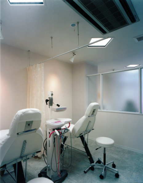 | フェイシャル室2 奥のフェイシャル室に隣接する、二つ目のフェイシャル室で個室感覚のスペースです。 二室の間はガラスで仕切られ、自然採光を取り入れた室内に、お客様、スタッフの皆さん、共に大満足のようです。 特に、正方形の照明を45度ふって取り付けた だけで、室内をより引き立てます。 この様に、建築を考える上でわずかなアイデアが、非常に重要となってきます。 主な内部仕上