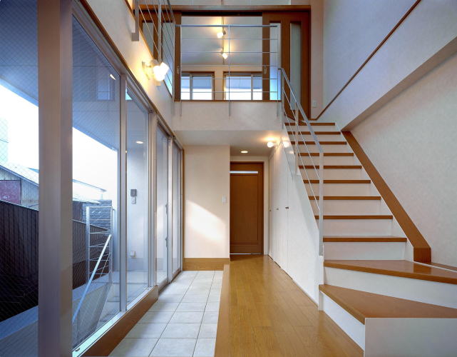 左の外部階段との間をサッシュとし、横に広い踏み込みをとりました。