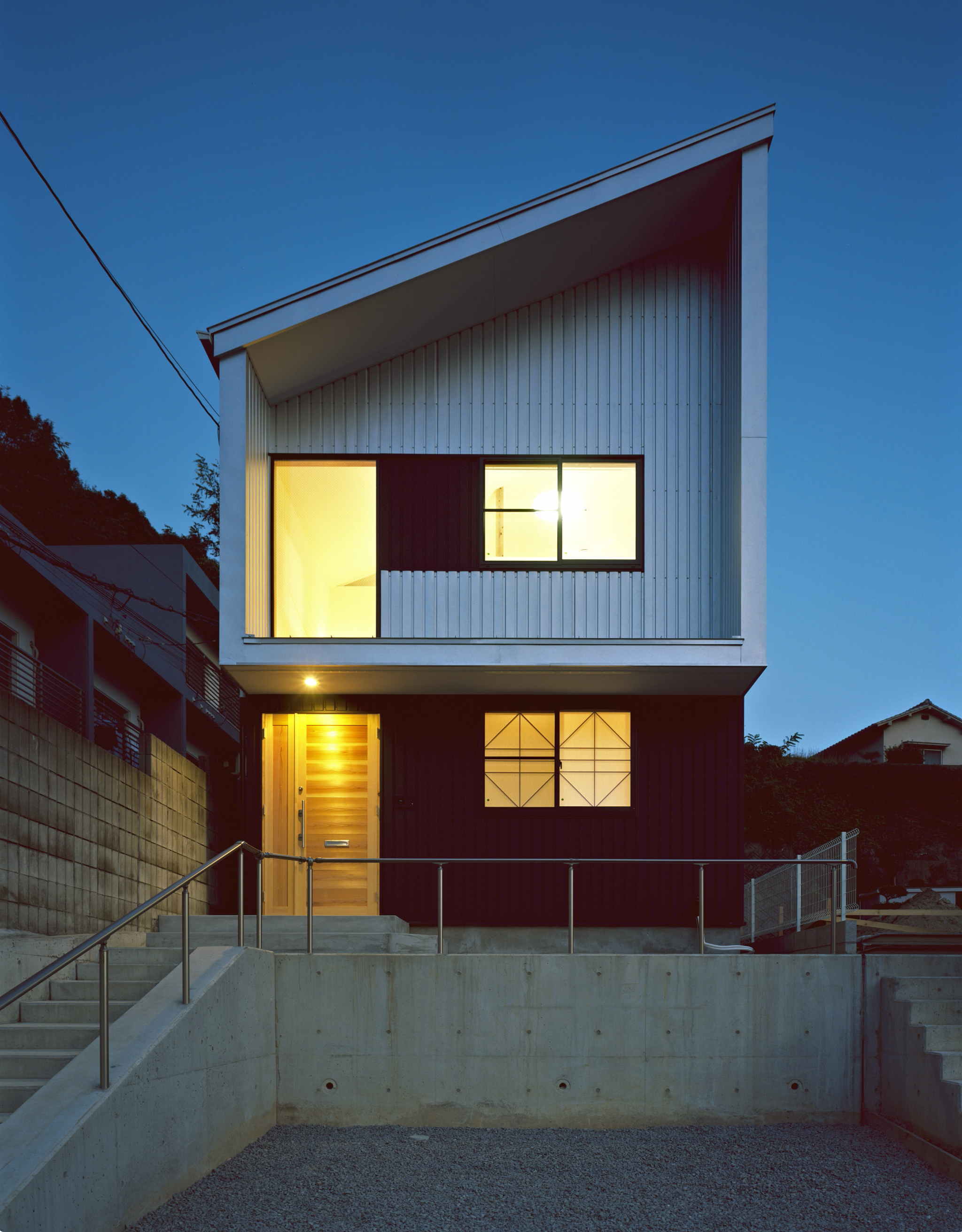 2階部分の片流れの屋根が大きな特徴です。