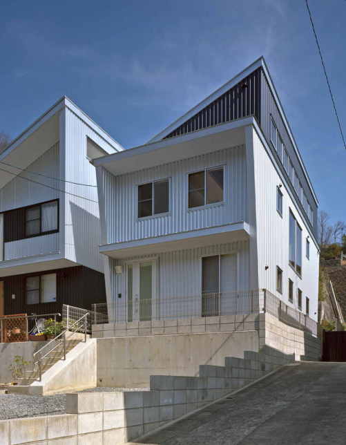 シルバーと紺色のガルバリウム鋼板で、外壁を仕上てあります。