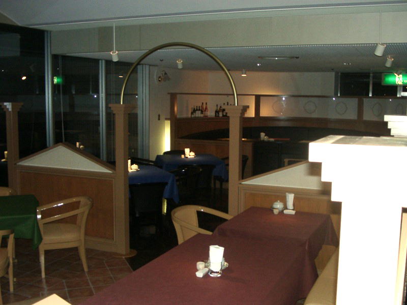| 2002/07/19 写真中央に見えるアーチがそれぞれの客席の雰囲気を変える区切りになっています。 また、テーブルのクロスや椅子等は装飾によりそれぞれの空間の違いを表しています。 |